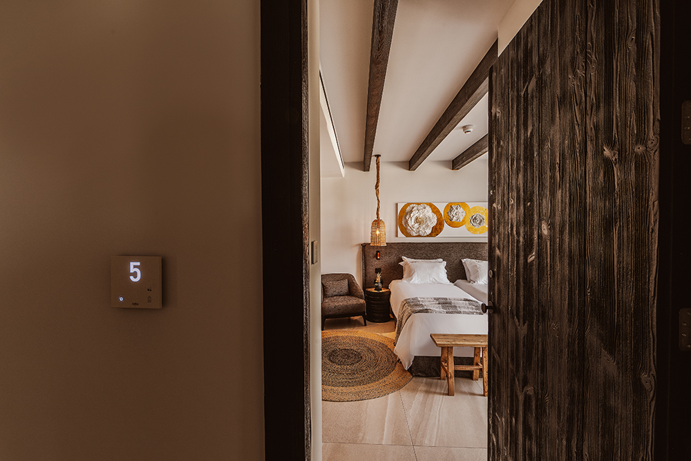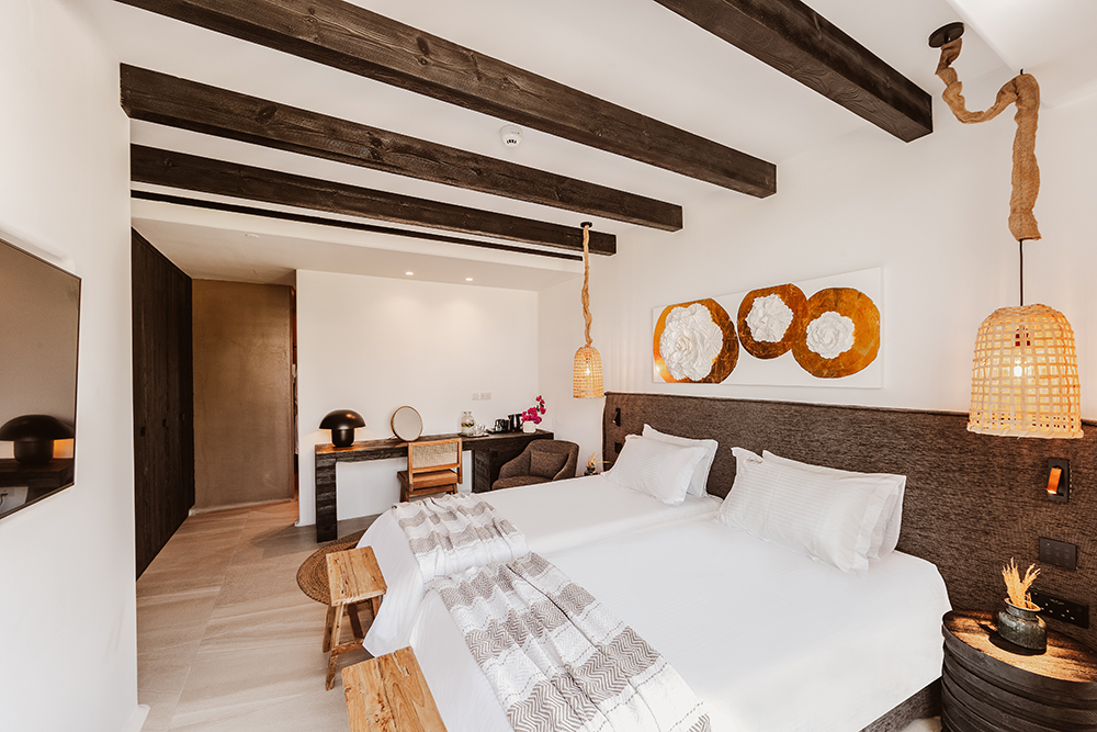 The suites are designed with elite taste and the whole structure is based on the well-known, traditional, mykonian style. for up to 2 person rooms, with large balconies and astonishing view of the mediterranean sea. the furniture is simple and comfortable and the king-sized beds have anatomical mattresses and a bedside guestroom automations console. the bedding is sateen cotton which is luxuriously smooth and drape over the body. the bathroom is luxurious, spacy & sunny.